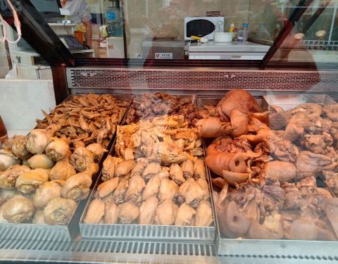 洛阳卖熟食的一家店,连锁经营,遍布大街,全城几十家估计是有了,乘车途中会经常看到,基本一致的店铺装修风格,统一的店员服饰,非常容易辨认。唐宫路店,位于唐宫中路和解放路的十字交叉口,与新都汇购物公园...洛阳卖熟食的一家店,连锁经营,遍布大街,全城几十家估计是有了,乘车途中会经常看到,基本一致的店铺装修风格,统一的店员服饰,非常容易辨认。唐宫路店,位于唐宫中路和解放路的十字交叉口,与新都汇购物公园隔路相对,占据一个拐角的橱窗门面设计,配合白底红字的招牌,很招眼的。买了刚出锅的炸鸡叉骨,今天有优惠,买20送10,另外,炸鸡腿块,买20送5,炸鸡腿,10块钱3个,20块钱7个,看着都还蛮有食欲的。还买了一个五香猪耳朵,切好后打包的。临走的时候,看到服务员在勤快地收拾橱窗外部卫生,顿时感觉更加放心。鸡叉骨,嫩嫩的,香香的,口感很好,基本都能吃干净。猪耳朵,新鲜入味,就是偏咸。总体感觉很不错。可以吃吃。