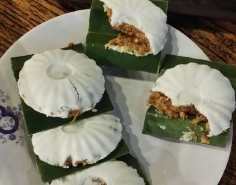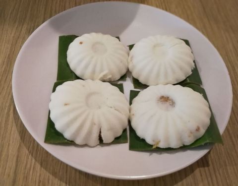 这家嘟嘟糕散发出的椰子与斑兰叶的新鲜香味,放在特制的蒸屉,不到一会儿就蒸出了那白嫩可爱的糕点,铺在香蕉叶上更香气逼人。