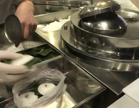 嘟嘟糕是新加坡一种类似蒸糕的食物,名称来源于,过去蒸糕的炉子,快好的时候会发出“嘟嘟”的声音。也有说法是以前卖糕小贩会骑自行车,沿途按住“嘟嘟”响的喇叭代替叫卖,长久以来就有了这样的名称。 嘟嘟糕一般都是现做现卖的,摊主是两个小姑娘,一个装料,一个蒸制,动作很快。做法是:把磨得极细的米粉均匀的抖落在一个小模子里,放入馅料,再撒一层糕粉,用扁扁的勺子抹平,入锅蒸一两分钟即可。 这家的嘟嘟糕有三种口味:原味、椰丝和花生。椰丝和花生的四个以下每只0.70新币,五个及以上每只0.60新币。原味的每只0.70新币。娘俩点了两只原味三只花生。刚出锅的嘟嘟糕散着热气和香味,白生生的,比手掌心还小,放在绿色的蕉叶上,小巧精致,非常漂亮。 轻轻托起一个送入口中,外层清淡,米粉细腻顺滑,里面的馅料略甜,比较松散。感觉这款糕点从做法到味道,都和我们西安的镜糕类似,不过镜糕的水分大一点,口感较粘稠,嘟嘟糕整体偏干,单独吃着挺噎的,配茶水食用应该不错。