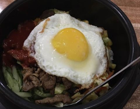 图里分别是牛肉拌饭和火腿拌饭,嘻嘻,好吃(*^ω^*)有胡萝卜,黄瓜,荷包蛋,还有偏辣的酱,不错哦!都是11块每份。