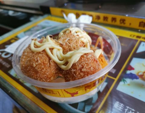 佛山祖庙后面的一条小吃街上,里面的位置不多,店面挺小的。不过一般都是打包边走边吃的,我们是点了一份芝士的丸子,口感非常好,远远比小丸子好吃多了。