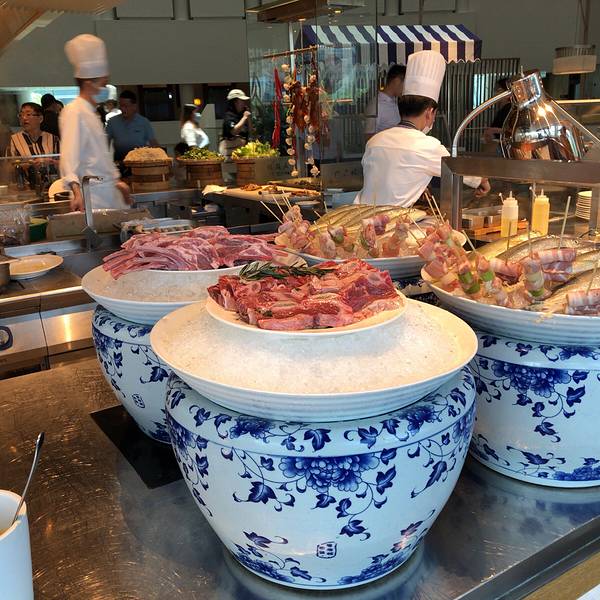 个人认为凯悦的自助餐非常美味。很喜欢这里的烧烤,鱿鱼和羊排都很好吃,羊排有特别的浇汁,口味很好。海鲜也很赞。这边每天的活动也不同,礼拜一会员日貌似很优惠,之后每天送不同地菜品。所赠送的大虾和鲍鱼饭口味很好。