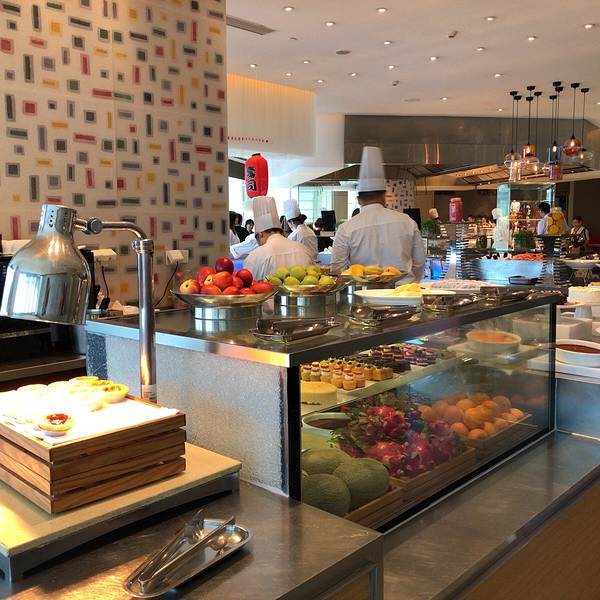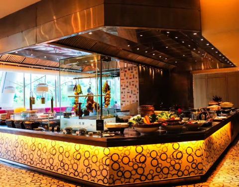 凯悦酒店咖啡厅现场制作中国各地风味、亚洲精选和寰宇美食,早餐、午餐和晚餐各具特色。咖啡厅两层楼高的落...