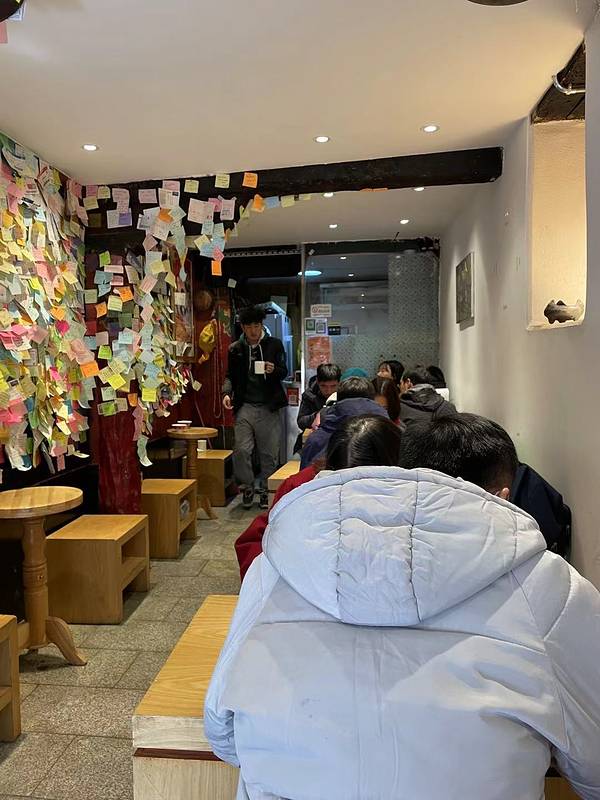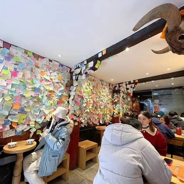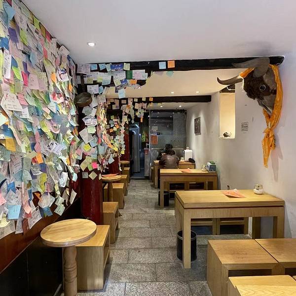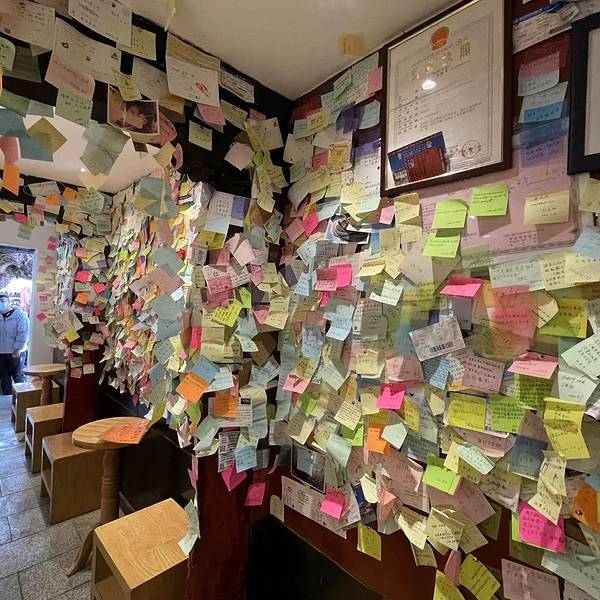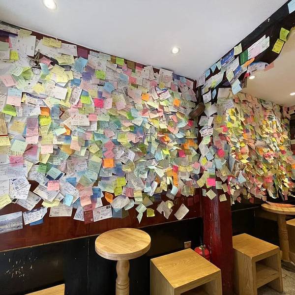 - 进去之后才发现这里不一般,满墙的留言贴纸记录了人气爆棚的时刻,而且灯光效果就是为了食客拍照点评设计的