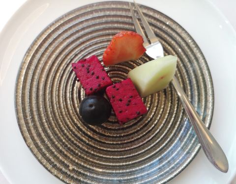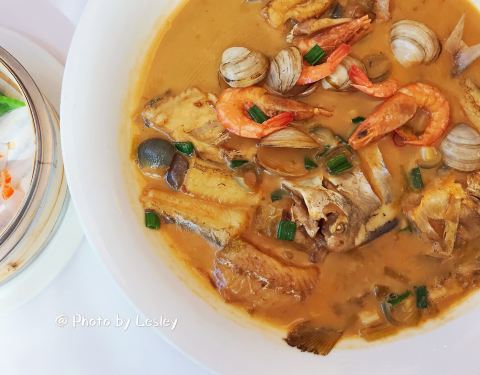 座落在巨鹿路这边一桩桩别墅里的黄鱼馆,提前几天预订了位子,中午人不是很多。落座上茶点餐。如糖的套餐很划算,餐前水果每人4种,都是我爱吃的,很新鲜很甜。高马二溪安化黑茶,第一次喝这个茶,没想到好好喝。 冷菜三拼:牛油果核桃手卷,不是很喜欢吃牛油果的居然把一整个都吃完了。野菌石榴包,这个不太习惯,没吃出石榴的味道。醋拌云南小瓜,这个酸酸甜甜的,有点像橘子味,造型又不像。 家烧东海小海鲜,海鱼海虾蛏子蛤蜊好多小海鲜放在一起烧,很鲜,边上还配了年糕,蘸点海鲜汁好好吃。 脆皮鸽,皮很脆,有点老了,鸽子腿都没肉了… 四喜笼,好可爱的造型,2荤2素虾饺墨鱼胶,蔬菜有吃到荠菜,其他一个没吃出来… 招牌黄鱼面,黄鱼很嫩,汤很鲜,面条不是很Q,但也不算粘牙,一般般。 桂花鸡头米,第一次吃鸡头米,不知道是啥…甜品是冷的,不太习惯…