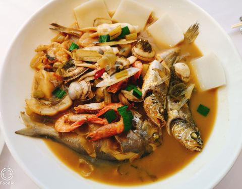 家烧东海小海鲜,海鱼海虾蛏子蛤蜊好多小海鲜放在一起烧,很鲜,边上还配了年糕,蘸点海鲜汁好好吃