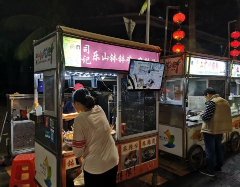 这家店铺也是挺花心思的,特意的在门口摆了一台电视,轮流滚动的播放他们家的电视节目,还有广告,的确是有点台湾夜市店铺的感觉了,而且这边也是特别人来人往的一个店铺。