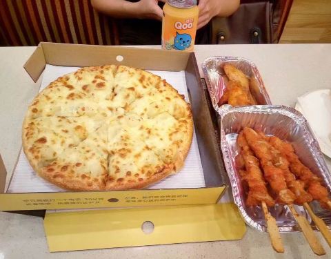 - 团购的58元两人餐,10寸披萨,奥良烤翅一份,骨肉相连一份,酷儿饮料两罐,实惠,好吃,正好够两女生吃