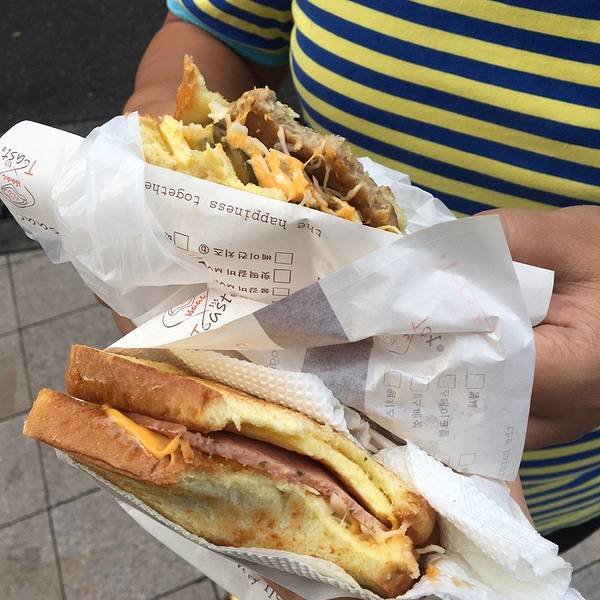 再次回到明洞,找到了原计划当早餐的Isaac三明治做下午茶,自从发现一家Isaac之后,它的招牌总会在不经意间出现。看来这家连锁店铺的生意真的很好。点了最有名气的烤排骨吐司,因为是下午,又是流水作业,所以基本没有等就吃上了。吃腻了泡菜味道的辣味食物,来一个烤得金黄的三明治,感觉味觉又被激活了。烤排骨三明治的分量很足,加上热量不可小觑的黄油芝士,整个下肚之后晚餐直接忽略不计了。