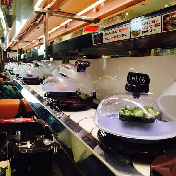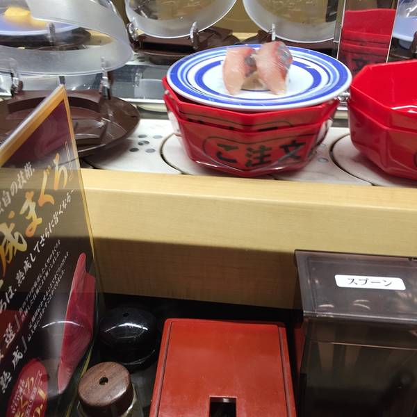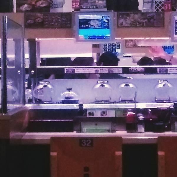 是不是这家分店我也不确定,在一个办公区域中营业,正是中午,排了好多人。非常便宜,差不多一盘5块!当然如果是为了吃最美味最新鲜的寿司的朋友们,那就别考虑吧 是那种回转寿司,就是之前微博上的热门话题#日本高科技回转寿司#的那种,哈哈哈想想就好激动,这么高科技会不会又露怯。。。