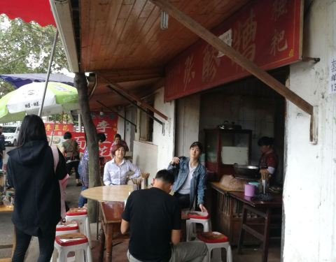 全凭口味取胜的一家苍蝇馆子。店铺很简陋,也很小,只有几张桌子,据说祖宗三代都是卖这个的所以百年历史了,只卖糍粑和醪糟两样。红糖醪糟,微火熬的红糖水,现捏的手工粉子,打个蛋,加勺醪醩,味道真的是好极了,醪糟味儿超纯;糍粑,非常软糯,加上现熬的红糖和芝麻豆粉酱很香,完全不同于市里吃到的油炸糍粑。