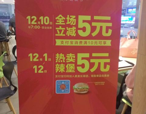 今天发现支付宝口碑搞活动,支付宝上面是写南宁东站的麦当劳"满10减5",我就跟小伙伴去南宁东站的麦当劳店面看看。结果看到门口的海报,支付宝扫码加入麦麦长草团,领取优惠券,就可以5块钱买一个经典麦辣鸡腿堡...