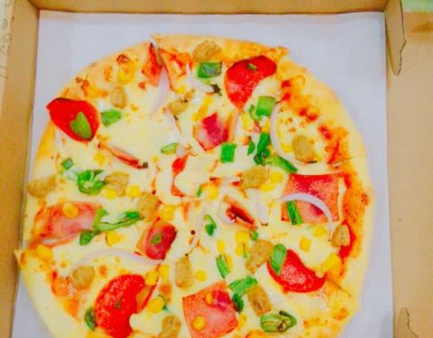 买鱿鱼烤肠双拼披萨打包回家吃的!挺好吃的!