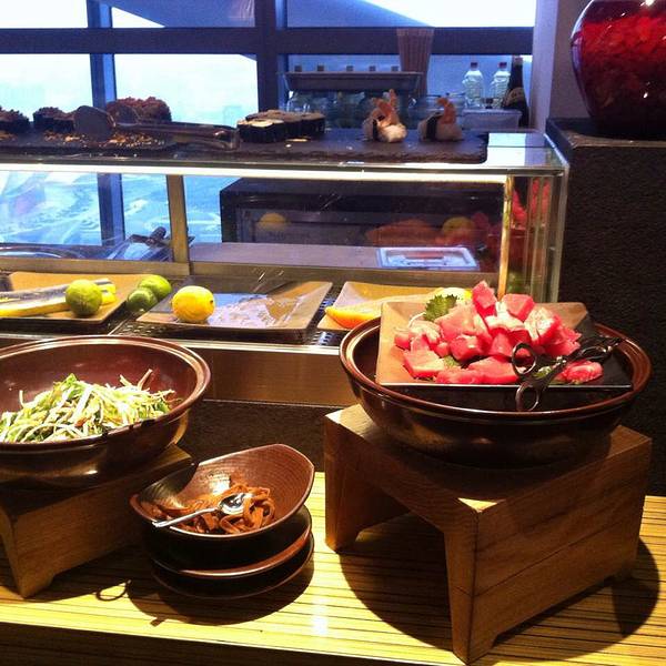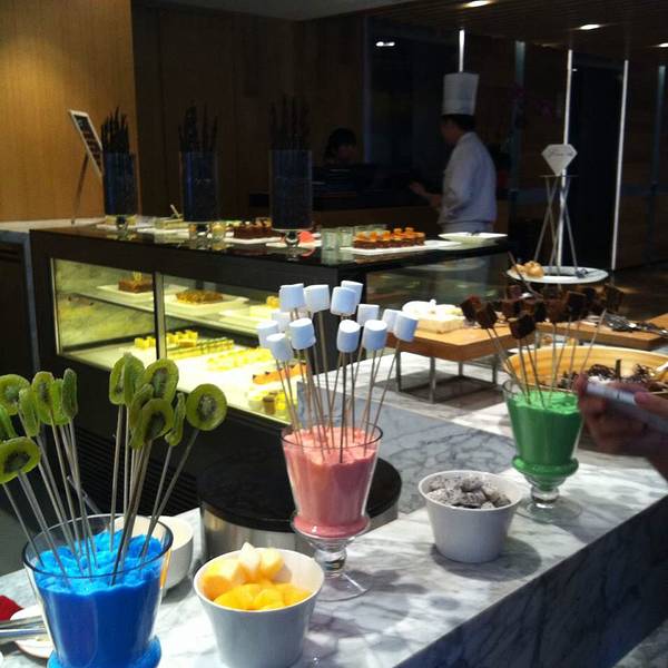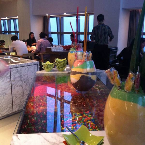 自助餐位于酒店60层最豪层,整个楼层就餐非常之大,360度景观,座位,卡座可选很多,但之前都要预定。还有亲子房,里面有电视沙发地板可坐,非常贴心的场地。进门的糕点是惊喜,非常色彩鲜艳,制作精良,榴莲蛋糕...自助餐位于酒店60层最豪层,整个楼层就餐非常之大,360度景观,座位,卡座可选很多,但之前都要预定。还有亲子房,里面有电视沙发地板可坐,非常贴心的场地。进门的糕点是惊喜,非常色彩鲜艳,制作精良,榴莲蛋糕用料是满满的榴莲肉,非常纯正。三文鱼刺身很新鲜,吃到一道美味就是牛腩,不仅品质不错,炖的筋道也刚刚好。夜景出来,吃着也是一种情调。酒店体验也不错,考虑下次再来。