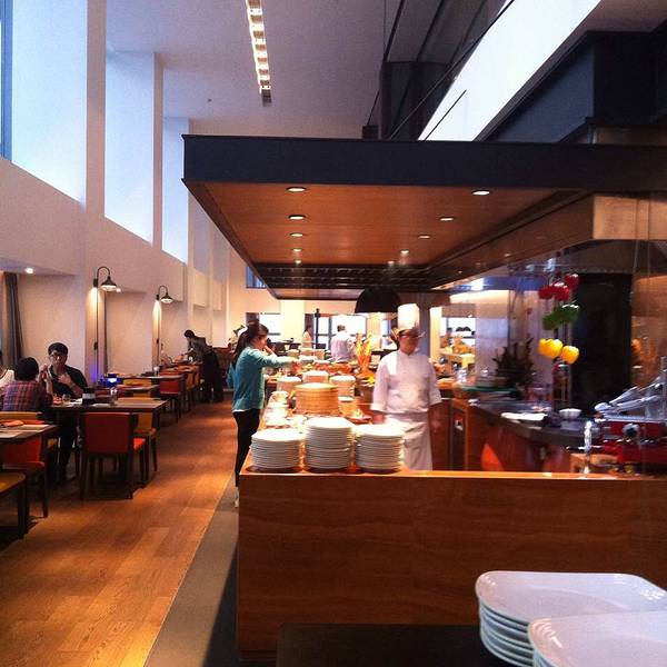 住宿带的双人早餐,10点结束,我们8点多的时候到的。餐厅景色异常好,一整层楼都是座位,四周是玻璃墙,可以清楚的俯瞰景色,是约会吃饭的好地方。 虽然是早餐,但是品种繁多,准备的一点儿也不含糊。各国风味早...住宿带的双人早餐,10点结束,我们8点多的时候到的。餐厅景色异常好,一整层楼都是座位,四周是玻璃墙,可以清楚的俯瞰景色,是约会吃饭的好地方。 虽然是早餐,但是品种繁多,准备的一点儿也不含糊。各国风味早餐摊位呈环形摆在大厅四周。 入口处有现磨咖啡,早餐品种有美式、意式、日式、新加坡、中式、韩式、欧式……中式有现煎的鸡蛋饼,法棍切片挺好吃的。水果种类很多,还有无花果、百香果…… 哦对,还有冰淇淋……服务很好,有个像新垣结衣的妹子主动问我要不要咖啡。总之,体验好,超值。