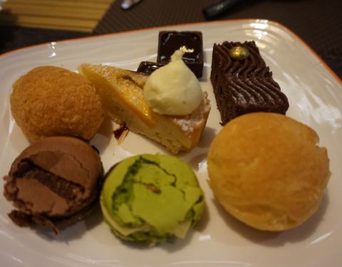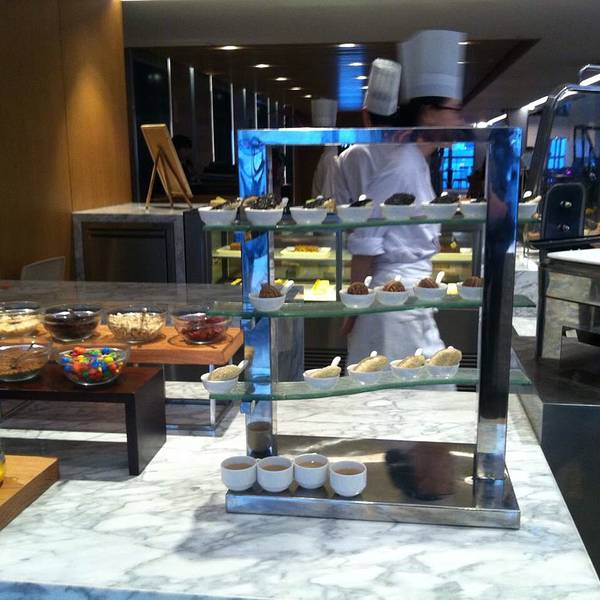住宿带的双人早餐,10点结束,我们8点多的时候到的。餐厅景色异常好,一整层楼都是座位,四周是玻璃墙,可以清楚的俯瞰景色,是约会吃饭的好地方。 虽然是早餐,但是品种繁多,准备的一点儿也不含糊。各国风味早餐摊位呈环形摆在大厅四周。 入口处有现磨咖啡,早餐品种有美式、意式、日式、新加坡、中式、韩式、欧式……中式有现煎的鸡蛋饼,法棍切片挺好吃的。水果种类很多,还有无花果、百香果…… 哦对,还有冰淇淋……服务很好,有个像新垣结衣的妹子主动问我要不要咖啡。总之,体验好,超值。