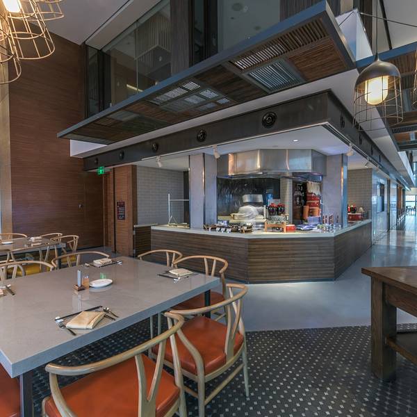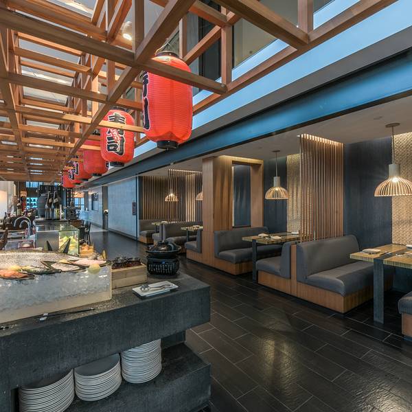 傍晚时分的餐厅显得有一丝丝的温馨与浪漫,阳光透过窗户照射餐厅,远方依稀可见的江景在夕阳下的映衬下形成壮观而美丽的画卷!坐在高空餐厅中一边享受美食的同时还能一边欣赏傍晚时分的江景风光,这种感觉很少有过。这家全日餐厅除了观景好、设计颇具艺术美感之外,还拥有很多主流的外国料理,比如日本料理专区、韩国料理专区等等,喜欢不同国家、地区料理的食客们到了这里就很有福了,可以很爽的让舌尖得以享受。