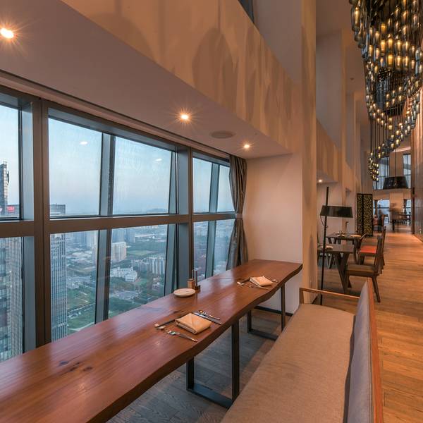 - 坐在高空餐厅中一边享受美食的同时还能一边欣赏傍晚时分的江景风光,这种感觉很少有过