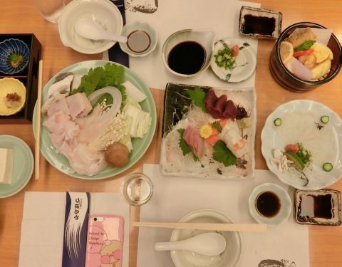 很贵的一家吃河豚料理的店,外面看上去很普通,但是这一家的河豚料理的品质却是数一数二的,所以价格也挺贵的。我们两个人点了一个套餐,里面叫河豚的刺身还有河豚锅什么的。