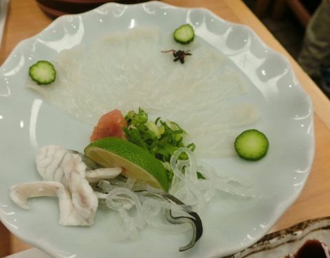 这是一家很多攻略都推荐的店 他们家河豚是特色 之前在国内吃的河豚是整只,鲫鱼大小。这次只见鱼的各种部位,猜测这鱼至少得半米长。有河豚精囊,意外地好吃。