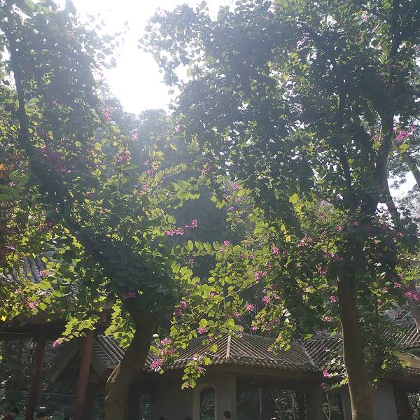 从宝林寺出来,已经快两点了,早上大家吃得很饱,不准备吃午餐了,在我这个胃友的坚持下,L姐搜索了附近的美食店,500米左右的路程处有家御膳粥老店,听店名也有点牛的样子。大家简单点了点普洱茶,山药粥,鸡爪,榴莲酥,白灼生菜,都很好吃。这三位同学啊,还是L姐有气质,剩下两位有点像抱头鼠窜!太阳有点晒啊😎大龟上面的小龟居然是活的,趴着一动不动。问了当地的司机师傅,说街道两边的是紫荆树,全是盛放的紫荆花。