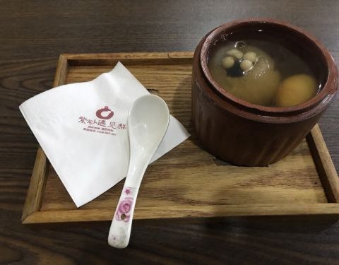 枇杷川贝炖梨,圆柱形的紫砂容器,很烫口,保温很好。 店员服务很好,没有区别对待