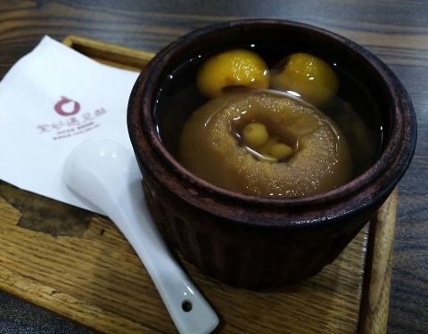 大石坝街上,夫子庙附近。寻着团购过去的,下午2点多,店里没顾客很冷清,但是外卖生意很好。美团上购买的,当场团购,当场验证,等了一会就上桌了。 枇杷川贝炖梨,圆柱形的紫砂容器,很烫口,保温很好。枇杷、一整只去核的梨里面放入了川贝,还有枸杞和红枣。汤水清甜爽口,一点都不腻人。 店员服务很好,没有区别对待。