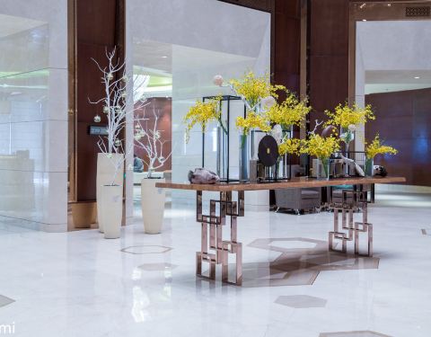 在这个日益发展的时代对于河南省的省会城市郑州来说,车水马龙,高楼林立的景象早已司空见惯。随着近几年一条条高架桥的竣工,一座座高楼的拔地而起,这座城市早已从一个冒着煤炉小巷的街道走向了现代化大都市。不清楚什么时候开始郑州,这座城逐渐变了,终于从每天的修路挖沟渐渐看到了一个充斥着新鲜血液的年轻城市。2011年,“中原第一高楼”郑东新区CBD标志性建筑——千玺广场正式封顶。这座被280米高的大厦被郑州人称作“大玉米”也是继“二七塔”之后新的地标建筑。从此郑州这座城市在建筑的历史上又增添了浓重的一笔,自2014年7月,国际著名酒店品牌JW万豪酒店正式入住千玺广场,从此JW万豪与这座楼有了不可分割的千丝万缕的联系。为了显示郑州日新月异的飞速发展,这座被称作“中原第一高楼”代名词的万豪酒店,自然成了接待朋友的首选。酒店毗邻现代化的郑州国际会展中心及河南艺术中心,优越的地理位置成为了绝佳的观景地,俯瞰郑东新区,一条雄伟壮观的陇海高架赫然显立在眼前,从清晨到日落,川流不息的车流直接性的反映出这座现代的城市的繁华色彩。步入大堂淡淡的香味扑鼻而来,富丽堂皇的装修风格是我对郑州万豪酒店的第一印象,诺大的空间前厅每天摆放着不同主题的鲜花。这座高280米的大厦高居云端之上,坐拥城市天际线和如意湖的窒息美景,城市中最高的茶餐厅自然也成了这里的代名词,慵懒的午后,一茗清茶,三两好友,附上女人最爱的甜点,促就了一场极美的时光。