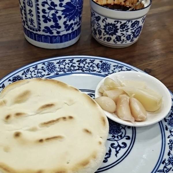 - 在店里很亮堂水盆还是原来的味道点一份水盆送—小碟糖蒜和一个饼粉丝和牛肉量刚好够吃汤味特别鲜辣椒...