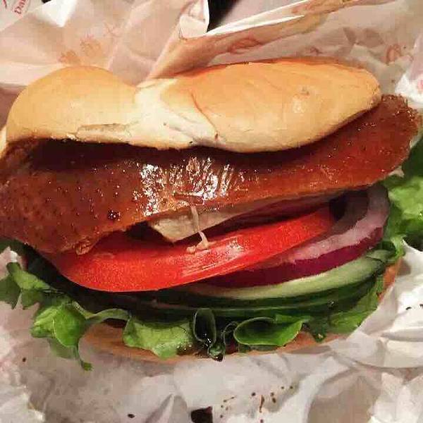 - 鸭肉汉堡特别好吃,而且味道和正常的烤鸭一样好吃,味道没得说,虽然感觉像吃了顿快餐价格有些偏贵,...实用