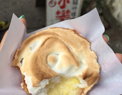 在绍兴,最有名的“小攀”莫过于高老太的小摊位了,一块泛旧的白色木板斜倚着一家小商品店,上面红黑大字十分抢眼。并不见有老太太,只有一对五十来岁的夫妇打理着店铺,打理着“小攀”,他们自称是高老太的后人。招牌后的木桌上的玻璃罩里排列着几个土黄色的“小攀”,因为没有太多的奶油,卖相不如西点那么鲜艳油亮诱人,这也正是中西烘培融合出来的质朴和健康。 热乎乎的“小攀”,拿到手中不太好下口,老板娘让我一定要端平,后来理解了她的意思,因为手腕一歪,里面的汁水就流了下来,好像这就是高老太的独到之处,我尝过其他店里的“小攀”,并没有这么多的汁水。所以吃相就不太好看,一下口就满嘴的蛋清乳脂,甜而不腻,十分爽滑,陷是软黄的,带着果浆的清甜,与外层松脆的小“碟”咀嚼一起,倒也不觉得很腻,但也不能多吃。 旁边两个女生已吃得相当狼狈,还问老板娘要水洗手,挺神奇的中西结合的传统甜点。