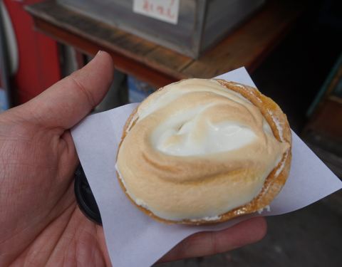 去绍兴吃到了传说中最正宗的奶油小攀,真是不吃不死心,一吃就死心,实在吃不惯;老板还是很客气的。 其实就是蛋白加糖打发后烘烤出来的; 底部的蛋黄液居然还有股腥味。。 如果是吃过莉莲蛋挞的朋友肯定不会觉得好吃。
