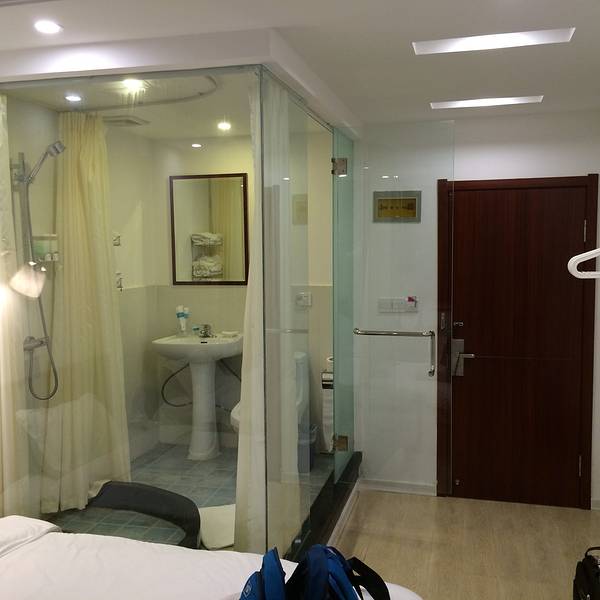 - 老婆选住所的第一原则就是干净的卫生,这也算符合要求了吧😄。精致的白石酒店前厅。简易却干净的酒店房间