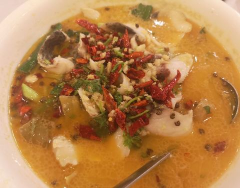 ...,烧鹅皮算比较脆,肉质还算可以,胡椒虾我觉得不错,胡椒味道比较浓郁,酸菜鱼份量比较少味道一般般