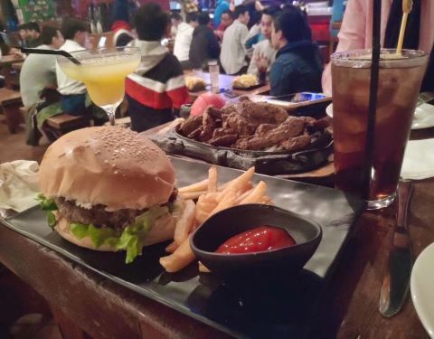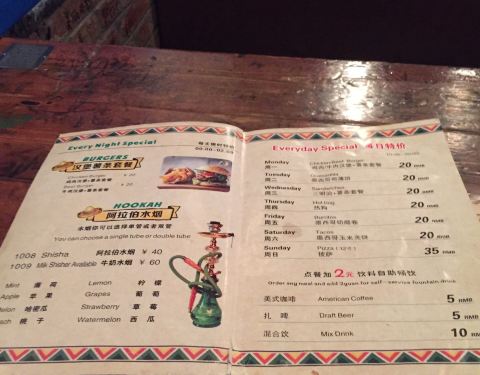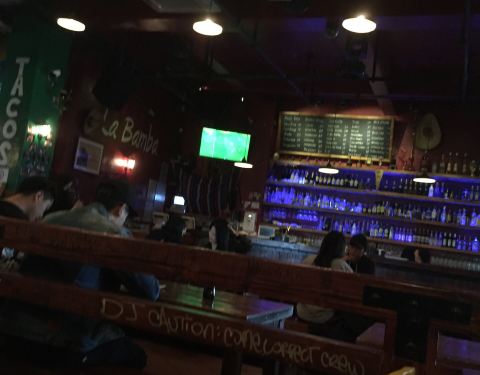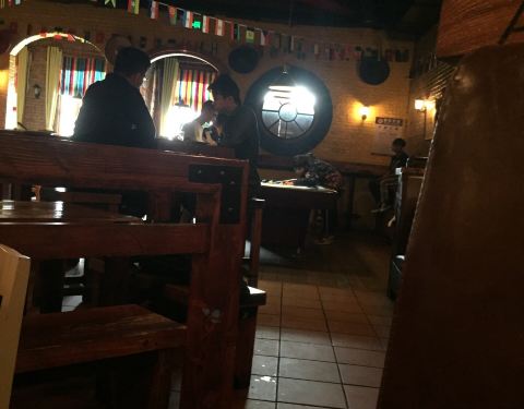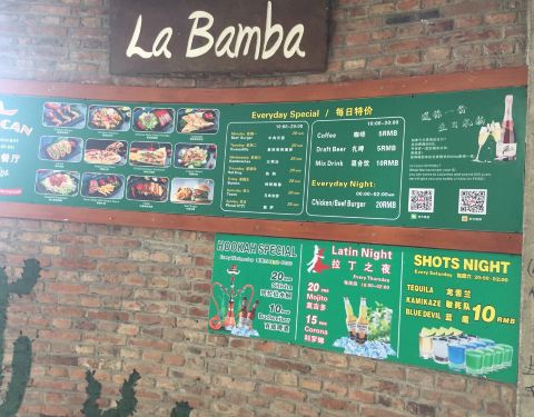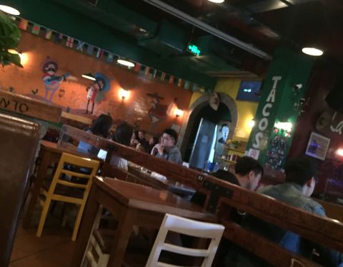LaBamba 1)店面位置:位于杨浦区国定路靠近政修路上的三号湾广场2层 2)店面特色:墨西哥餐厅和酒吧,店内有台球可以免费打,点餐+2元饮品(雪碧、可乐等)自助畅饮,主营汉堡、薯条、披萨、墨西哥薄煎饼、三明治、沙拉等西餐以及阿拉伯水烟、酒水等。 主食中墨西哥鸡肉卷饼是特色。顾客以周边复旦学生和外国留学生居多。夜晚,餐厅里比较热闹喧嚣一些。 3)店面环境:比较国际酒吧范,店面空间比较大,堂食座位有四人卡座、靠窗座位和两人小桌,木制桌子上有各国语言,吧台附近有电视屏幕可以看世界杯。 4)用餐体验:到店后入座点单,有免费白水供应。出单速度较快。 凯撒沙拉1份38 元,分量很足,肉量也很实在。鸡肉薄煎饼1份38 元,薄饼卷着鸡肉丝比较入味;鸡米花、炸鸡翅的味道有点中国卤味的口感,中规中矩;炸薯条份量比较足,但不够脆。 5)餐饮价格:人均¥70元左右