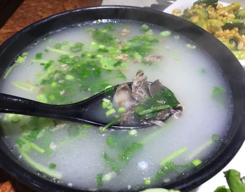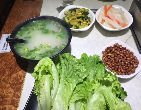 之前去吃旁边的鸭血粉丝,看到门口在分切整只羊,就觉得这家羊肉应该不错 羊排、羊腿称斤卖,一般现场都有,按人数点个多少斤,半只整只的可能要提前订,3斤羊排即使加上了骨头的重量,3人依然吃撑,羊肉很不错,在南方能吃到嫩口多汁鲜美,又没什么膻味的羊肉,也不容易,羊肉切了花刀,但切小块还是不太容易,这可比切牛排费劲,羊肉肥瘦相搭,好吃的紧,不蘸调料就可享受原汁原味的羊肉美味 店员说怕腻的话可以羊肉包着生菜吃,总觉得这种思密达吃法有点怪怪的,所以生菜都没动过 羊杂汤也很鲜,其他小菜也不错,烤土豆片很好吃 宁波这儿爱吃肉的人不多,像这样大口吃肉的感觉确实很爽