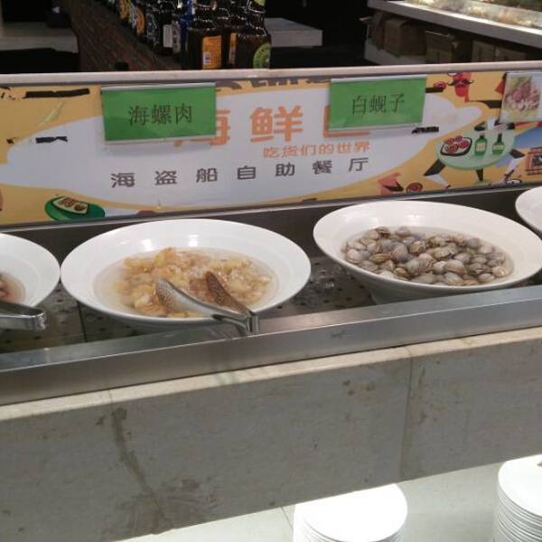 长春吃过好几次自助,相比较而言海盗船的性价比还是很高的,团购价格50元,有海鲜,店大品种也特别多,主要是新鲜好吃。店内可以自选烤肉或者火锅的一种,个人来说我还是比较喜欢烤肉的。[服务]出电梯就能看到海盗船的牌子,到店要交10元押金,团购处理速度挺快,非周末时间时间有2个半小时,周末就2个小时,但真的能吃到好多东西。吃的时候换纸撤盘速度也快,想拍空碟变山的照片根本没机会。[环境布置]店铺面积特别大,有包厢,但要提前预定,食品区包含熟食区、海鲜区、肉类区、调理区、甜点、酒水各种各样的美食区,安排合理各类型也集中。[美食推荐]他家的小龙虾、大螃蟹、铁板鱿鱼、新疆大肉串、烤鸭都是特色,一般要排队等候,大肉串、烤鸭、蒜蓉扇贝等特色晚上才提供,小龙虾倒特别受欢迎,好多人拿,很快就没了,味道还是很棒的。[交通位置]海盗船自助在红旗街巴黎春天7楼,红旗街算长春最繁华路段了,各路公交都到,最棒的是54路有轨电车的始发点就在巴黎春天楼下,怀念以前的小绿皮车。吃累了到楼下逛街或者去对面电玩城玩游戏都是很棒的选择,巴黎春天对面是万达广场,再走得远点就是长影旧馆,今年78月份晚上有免费音乐会,吃饱了去消食真的很不错。