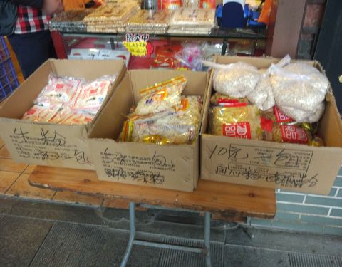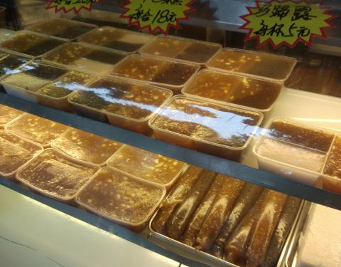 有次和LG去完逛荔湾湖公园后,路过这家位于泮塘路的“泮塘老铺”,看到里面挺多传统糕点的,还有芝麻糖、花生糖、瓜子酥之类的传统食品。 我们还看到门前有个石磨,在转动着的,不过只是作为装饰品,有流水从上面传到下面的木桶里,挺经典的装饰物。 年糕、马蹄糕、双色糕摆满了玻璃橱柜。还有5元一杯的马蹄露,应该是新鲜榨出来的。 上面那些传统食品,我们都没买,因为刚刚已在别的店里吃饱了小食。 我们看到门前的小桌子上摆放着几样特价促销的生粉、蝴蝶粉、通心粉、南瓜粉,我对这些比较有兴趣。哈。于是买了5元两包的生粉和10元两包的通心粉。选了一包通心粉和一包螺丝粉。拿回家之后煮来做早餐,挺好吃的。以后若再次路过,还见到有这些通心粉之类的特价的话,我还会再买的。