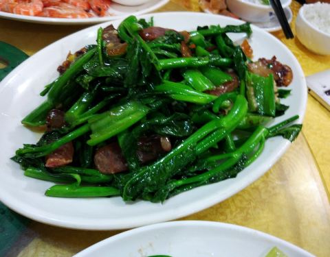 4月1号下午和朋友们去海鸥岛玩了一下午,然后开车回到番禺的石碁镇,经熟悉附近的朋友带路,我们来到了这家食健坊。一进门,看到满大厅都是食客,非常的热闹,也比较吵。不过一看就知道这里都是做附近街坊生意的,所以菜式都是很实惠且份量大。 我们6人,点了6菜一汤,埋单是271元,人均是45元。大家都吃得饱饱的。 (1)花生眉豆猪骨鸡脚汤,是这里的例汤,38元一大煲。很多猪骨、眉豆和花生,都煲得很淋很淋,好吃。特别是花生,非常多。我LG吃了好多花生。以致我们两周后带家人亲戚再来的时候,他也专门再点了这个汤。 (2)白灼明虾,很新鲜的虾,肉质爽甜! (3)蒸双饺,很大的一笼,几乎看到当晚每一桌都必点这个。小的饺子的皮透明,估计应该是用糯米粉来做的,里面有肉有冬菇,而大的饺子应该是普通的面粉皮,里面有肉有菜,两种饺子都不错,挺受大家喜爱的,很快就被扫光了。 (4)荷芹炒鱿鱼,都是新鲜的食材,份量多,够锅气,不错。 (5)腰果猪肚丝,这个是凉拌菜,有很多黑木耳和腰果,还有一些鲜淮山和荷兰豆,猪肚丝不多,被淹盖在里面。吃起来挺爽口的。 (6)铁板酿茄子,酱汁调得很好味,非常的下饭。 (7)芥兰炒腊味,芥兰好爽脆,腊味也挺好味。 赠送了一个果盘,是甘桔,挺甜的。 这次大家都吃得挺满意,所以我们后来带亲戚再来了一次,第二次点菜全是亲戚们点的,第二次时大家觉得菜式比较偏咸。