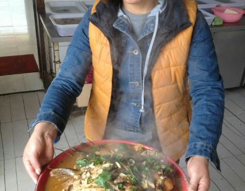我们是一家人十二点半来的,进门非常热情,点完菜之后还是和别人拼桌,二点十分上的菜,点的鱼里面没有豆腐和粉条,就给你私自加东西,鱼都上错桌,鱼的口味一般,他家的菜咸的咸淡的淡,鱼都没做熟就上来,米饭是一盘上,跟团餐是的,鲤鱼35元一斤,胖头鱼45元一斤