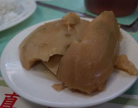 继续寻找美食,清真惠记,隐藏在铜锣湾鹅颈街市内的一间平民餐厅。 餐厅就在市场内的二楼,大排档的简陋装修,一块小小的地方就有几间唔同的餐饮店铺,门口摆放着简单的桌椅。选择在那件餐厅吃饭就坐在哪家餐厅的门口的桌椅,这里人来人往很多人帮衬。 菜单上的左上角和右上角都分别有清真字眼和符号,因此这里是不能进食猪肉的。这里的餐点在香港来说是很平民的,推荐的食品是咖喱羊腩和柚子皮。 古法虾子柚皮,这是我第一次吃柚皮,平时是一点也不吃的,感觉味道挺清新的,不会有苦涩味。仲有另外一点是可以解辣,吃咖喱羊腩感觉很辣的时候可以吃上一小口柚子皮可以舒缓一下辣味。 咖喱羊腩饭,咖喱汁可以任加的,羊肉吸收了咖喱的味道,不会太油太辣,没有骚味,羊肉焖得软韧适中,在碗的底部还有几块薯仔,咖喱汁好味到原本饱到不想吃饭的同伴们都忍不住要叫老板加咖喱汁,把这些白饭吃完。 咖喱羊腩面,同样的咖喱汁和羊腩,面是采用碱水面,爽口,有弹性,感觉面比白饭还更能吸收咖喱的味道,更为好吃。 小小的店铺有大大的惊喜,价格也不贵。很满足。