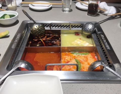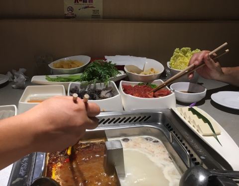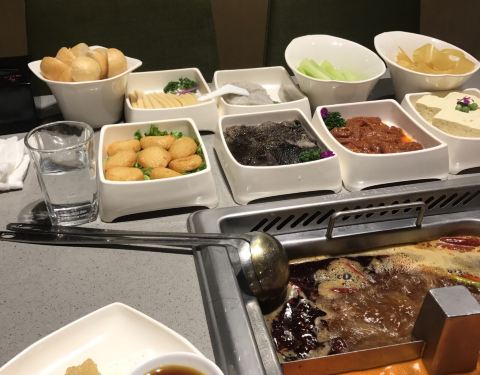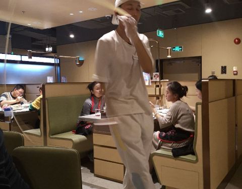 闻名许久的海底捞啊,好不容易到了上海,在有人请客的情况下,终于还是去吃了一次,位置倒是好找,就在人民广场上的第一百货5楼,我们去的时候都要9点了,还排了下对,这让我彻底的见识了海底捞的人气,服务方面觉得还好,点了一个鸳鸯锅底,终于也见识了吃火锅用麻酱的了,当然,在那个桌子上只有一个吃香油碟的我大概才是异类吧!海底捞的锅我觉得不合理的地方是它整个就在桌子里,夹菜很不方便,点菜用的ipad,要吃什么自己勾选下单,这点还是很方便的,但是价位嘛,真的是让我接受无能啊,随便一个荤菜50左右,一个素菜20左右,这让在重庆吃惯了十几荤菜的人真的有点不敢点肉!就让朋友选择,他们选什么我吃什么,他们的锅底应该还是比较健康吧,对重庆人来说简单点就是没啥味,当然重庆的火锅对大部分地区的人来说确实也太众口味,还是那句话,众口难调,自己爱自己的口味就好了,第一次在海底捞见识了烫鸭肠的架子,感觉还挺好玩的,鸭肠也比较脆,必须说海底捞的菜品确实新鲜,贵还是有贵的理由的,也有免费的饮料、水果、粥,最好玩的还是功夫面了,一个帅哥拿着面团,在我们面前舞啊跳啊,姿势优美,一会儿就把面团拉成面片了,虽然我们吃到后面有点吃不下了,但是为了再看一次拉面,我们又点了一次,给拉面的帅哥一个赞吧!