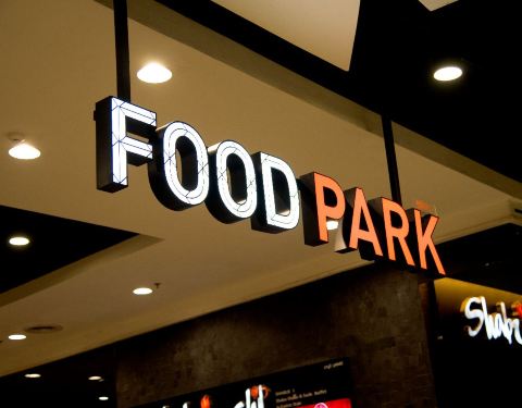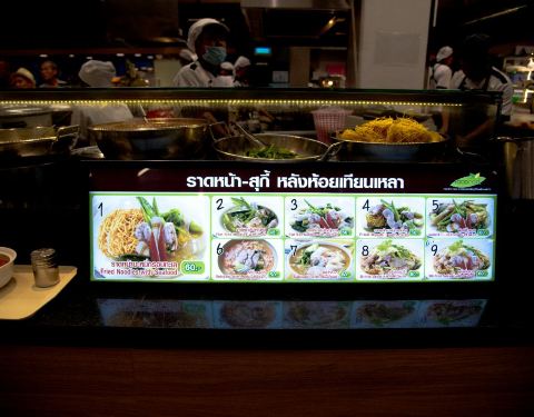 这是位于曼谷市中心中央世界对面,BigC购物中心内的食阁。经营模式和大食代相似。先在柜台买卡再到里头不同的熟食摊位选择。