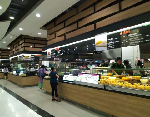 这是位于曼谷市中心中央世界对面,BigC购物中心内的食阁。先在柜台买卡再到里头不同的熟食摊位选择