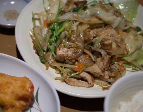 野菜炒肉满满一大盘子,里面有猪肉片、卷心菜、绿豆芽、胡萝卜和荷兰豆。味道说实话谈不上很好吃,就是最普通的中华料理店的水准。味噌汤对我来说是一如既往地偏咸,空口喝吃不消,用来过饭正好。冷豆腐本身是没有味道的,自己淋上点酱油就好。野菜炒肉套餐690円,包括野菜炒肉一盘、米饭一碗、味噌汤一碗和冷豆腐一碟。