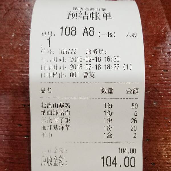 而啃完糯米剩下的干净外皮,百分百纯椰肉打造,不用手挖,直接可食,方便至极,不过应该是汽蒸脱水的缘故,比普通椰肉皮硬上许多,纤维感极重,属于越嚼越香回味型,但真的很费牙口,加上糯米的分量不少,椰肉皮小嚼两口尝尝就好不必多吃~丽江紫洋芋:也是颜值很高的一道小吃~ 特色的紫洋芋,切成薄片之后呈现的紫色花纹很是漂亮~ 入口薄脆香酥,口感像极了小时候的天使土豆片,不过更加的薄酥,还带有油葱香气,十分好吃~ 不过土豆大片又薄,师傅在调味与火候的掌控上还有些不足~ 完美调味与口感的土豆片不到四分之一,其他的多少都存在过咸或者不酥脆咬不动的情况,算是美中不足吧~这道紫洋芋,不仅只有配料与土豆片,还有伴有云南的腊肉片在里面,炒得很是干香,有些过咸,算是多了一个无功无过的东西吧,用来下饭还是可以的~老滇山寨鸡:以店名来命名的菜式,算是招牌之一吧~ 属于复合口味的菜式,使用酸木瓜、山椒、青红椒、老腊肉及攀枝花等多种带有各自酸甜咸鲜风味的食材来衬托咸鲜油香与鸡肉香气~ 鸡肉不算嫩气,有肌肉的弹性及纤维感,肉块入味,带有微弱酸甜,重油香及咸鲜,食材复合的味道毫不冲突,调味细致,值得推荐~纳西炖猪血:猪血的口感不错,调味香辣咸带有微姜蒜味,韭菜回甜,不算重口味的菜式,但还是很下饭的,而且只要6元,超级便宜,导致点击率很高~她们家的老滇山寨鸡与云南椰子饭都推荐~ 丽江紫洋芋有坑,小部分超好吃,部分一般,部分不好吃,不过好吃的那小部分真的相当不错,还是推荐吧~ 纳西炖猪血,一般啦,不过真的就是胜在便宜~最后大家都以为“黑珍珠餐厅”一定就很贵是吧~ 我点的分量完全够两个人的食量的,请看账单~
