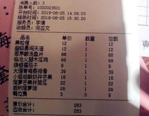 出去觅食前在网上找了一下,发现这家店在网上的风评数一数二,就选定了这家店。 老滇山寨在昆明有好几家分店,我们吃的是昆明火车站附近的这家,去的也是有点晚了,下午两点多钟,虽然顾客还是很多,但是很多我们想要吃的菜已经没了。 这次在云南昆明、大理玩了好多天,感觉云南的餐馆总体而已都挺合口味,只有这一家,不是餐厅的问题,应该是我们自己口味的问题,我觉得很像东南亚比如泰国的菜的味道,我个人不是非常习惯。主要是里面的香料什么的有点不太能接受,喜欢异域风情或是喜爱东南亚菜系的人应该会喜欢吧。我个人觉得还是两个含芒果的菜和点心最合我胃口。 餐厅的装修风格也是很有少数民族风情,总体而言,云南餐厅的菜价都不贵,两大一小点了一桌子菜才283元,菜的份量也挺足的。