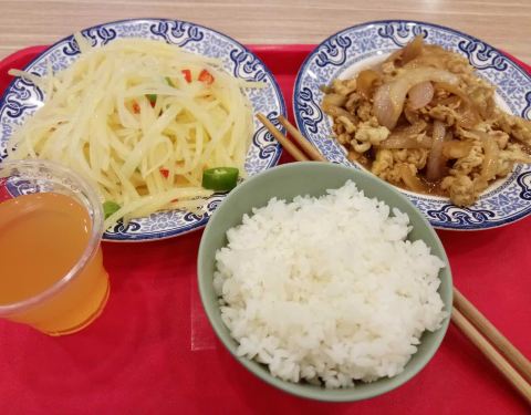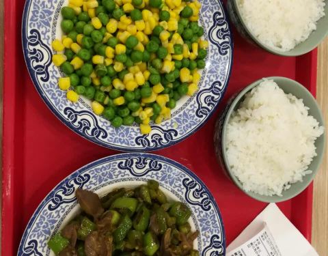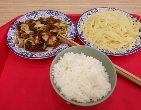 价格实惠2个人1个炒豆芽1个洋葱炒鸡蛋2碗米饭才12元,比隔壁的素食餐厅划算