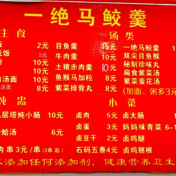 一绝马鲛羹位于厦门市环岛路黄厝海滨浴场附近的黄厝名点美食城里面,这是我继2014年来这无意间吃饭的时候发现的一家小吃类型的餐厅,一年之后的今天到达此地这里的美食广场几乎是名存实亡了,仅剩下这一家一绝马鲛羹餐厅了,顿然家勾起了我的兴趣,为何其他餐厅都纷纷的关闭了唯独此家还能独自生存呢? 带着意外的好奇心进进入餐厅,老板夫妻两人居然还记得我去年来这里吃过饭。 像亲人一样的问候,并拉起了家常一样的说起来2015年厦门市旅游市场经济去去年惨淡很多,尤其是黄厝一带更为严重,很多餐厅因为没有生意而房租太高撑不下去了,老板说他们是靠好的口碑与低价格的产品吸引了很多的回头客。其实吧,此家一绝马鲛羹对我而言确实很不错,至少价格与口味是最大的亮点,在厦门能够找到这样低价格并且味道不错的餐厅实在很少了,因此我认为老板说自己的口碑好与高性价比带来的回头客应该不是吹嘘的。 那么,山野君就此餐厅的真实而详细的情况就一一分类说说吧,希望来能够为来黄厝吃特色小吃的驴友们提供必要的参考。 【餐厅环境】 餐厅的整体面积不是很大,看起来不超过40平方米,是单独的一家商品房店铺的规模大小,属于普通的小吃店类型的餐厅,但是卫生方面还是很不错的,亮化工作也是很到位,在夜晚就餐不会昏沉沉、黑压压的感觉。【餐厅服务】 餐厅上由一对70后的夫妻开办并经营的,夫妻两人感情看起来挺好的,服务态度很热情。 两个人都是厨师与服务员的双重身份,二人除了招呼客人之外,还要亲自小厨做食物。有时候还会打扫卫生。不论是人多还是人少,服务质量态度一直都很好,希望继续保持呀! 【食物口感】 这里是食物都是闽南地区正宗的小吃。因为老板是土著的厦门人,所以口味还是很地道正宗的,我吃起来比较喜欢的。 【推荐的食物】 该店比较值得推荐的食物很多,但是我最为喜欢的就石马五香、马鲛羹汤、秘制咸饭和姜蒜炒花蛤以及妈妈味青菜这几样,吃起来非常的爽口,至少是我在厦门地区吃的最为满意的一家了。【人均消费】 这家餐厅的物价不高,去年我来厦门去了中山路和鼓浪屿之后发现厦门的物价水平超过了上海了,但是在这里可以找到与全国消费水平持平的餐厅,一般而言正常的人均消息在15-23元之间,而且吃的很好。其人均消费大约只有中山路、鼓浪屿等地区的40%-55%,非常的划算。 【交通位置】 一绝马鲛羹这家店的交通位置非常好,乘坐29路公交车到达黄厝海滨公交车站下车顺着黄厝中路步行到黄厝名点美食广场进入并走到顶部即可找到餐厅了;或者是乘坐公交118路车到达终点站黄厝站出来往右手方向步行60米即可到达美食广场再走到顶即可到达了。 如果是要去厦门高崎机场可以乘坐29路车或旅游通勤大巴,如果是到高崎机场可以在公交车站乘坐机场大巴,如果是到厦门北站的话可以到东方花园乘坐954或者950路等公交车直达厦门北站。 【周边环境】 周边的环境非常的好,除了占据厦门市环岛路最为的海景风景之外,还可以方便的到达以薰衣草为文化主题的香草园、黄厝海滨浴场与椰风寨等景区、景点,从这里顺着环岛路步行可以到达中国离台湾所属的金门岛最近的观光点。 从餐厅所处的黄厝海滨公交车站可以很方便的到达帆船游客中心、金水湾直升机体验中心、厦门国际会展中心,到达厦门火车站和高崎国际机场都比曾厝垵、中山路、鼓浪屿等地要方便很多呢。【营业时间】 为了写完全,并真实的写这个点评。我特地问了老板的营业时间是从早上8:00-22:00 。 最后,我在这则点评里为老板加油,希望老板的生意越来越好!也希望黄厝也加油,希望黄厝这块优美的旅游胜地能够得到更多的人的认可与赏识!黄厝,我会再来的,更会经常来厦门找你玩的哦!