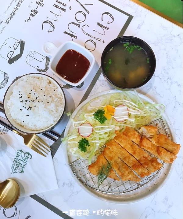 🍱#日式炸鸡饭# 46元。我觉得这个不推荐。是套餐,一个炸鸡排配饭和一份例汤。鸡排炸的干且硬,一点不好吃,汤是味增汤,很咸。虽然看起来颜值还行,但真是空有其表。